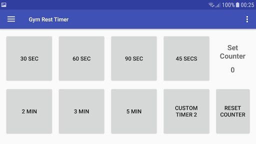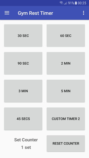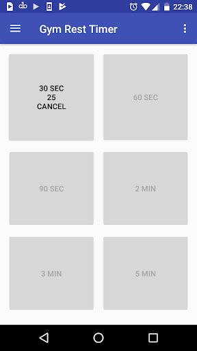 Simple one click timer for the six most common weight training rest breaks - 30 secs, 60 secs, 90 secs, 2 mins, 3 mins, 5 mins. (And also 2 user defined timers if needed.)