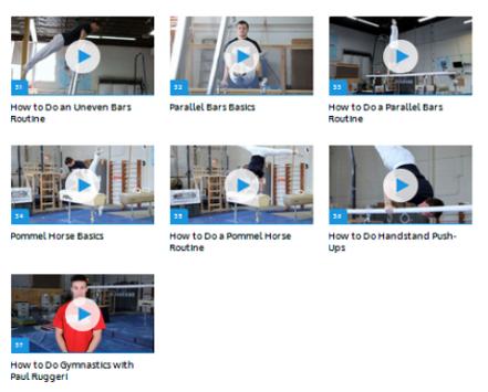 Learn how to do gymnastics moves on the floor, balance beam, pommel horse, parallel bars, and uneven bars in these Application videos.