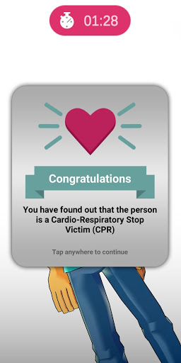 Using as a background the eLearning concepts adopted by the WHO’S Health Academy program, this app was developed to be a tool to INSTRUCT the recognition of a cardiac arrest and the first response to a CPR. It was basically developed for lay people, either adults or school children, based on the advantages of the educational process conventionally called “gamification”, with emphasis on interaction and feedback. We tried to show different random scenarios, as well as use elements to motivate and challenge the players and focus their attention in order to learn the subject. One of the game’s functionality is the non-progression of phases, in case the players choose a wrong answer, so that they memorize the correct sequence of a CPR protocol. The app is not aimed at assessing the learning process of the topic, but it provides a score system for players, in case they choose to check their performance. Although the game is NOT INTENDED TO EVALUATE KNOWLEDGE, it has a score system so that the learners can check their performance.