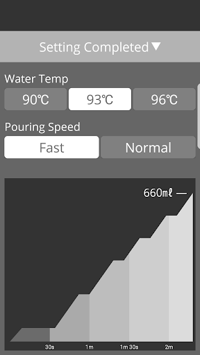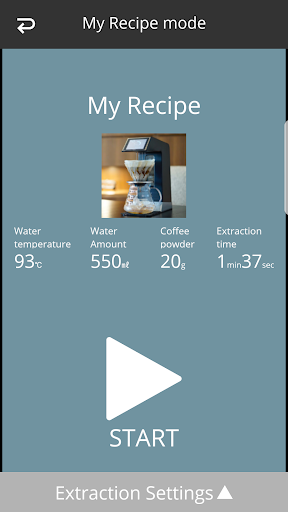 3. My recipe mode: You can freely set the amount of bean, the amount of water, the temperature, and the extraction time (including blooming) to maximize the character of the coffee bean.