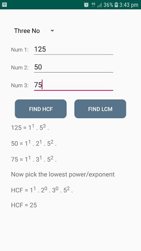 LCM and HCF calculator calculate hcf and lcm of any numbers. HCF and LCM calculator provide you step by step solution of the problem. Current version of the app support hcf and lcm of up to 3 numbers. We are planning to increase this numbers very soon in gcd calculator