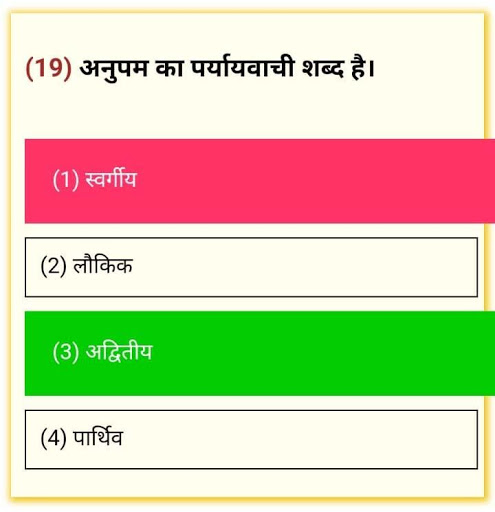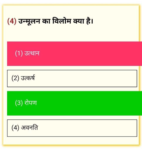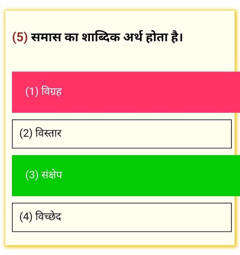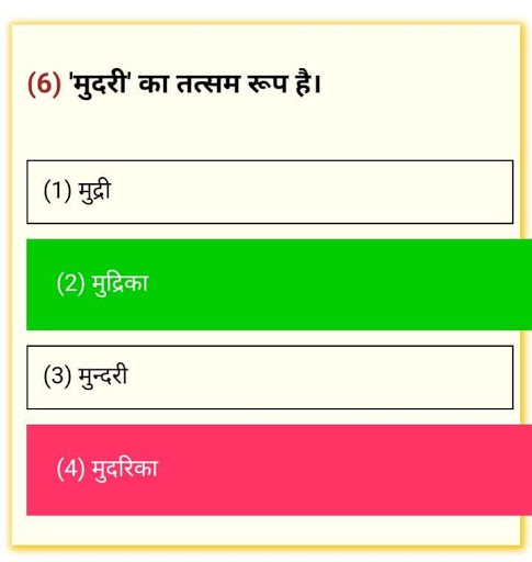 प्रतियोगी परीक्षाओं में सफलता के लिए theory/concepts की असली समझ तभी मजबूत होती है जबकि आप MCQ का अभ्यास करते हैं। HINDI GRAMMAR & PEDAGOGY QUIZ का अभ्यास करने से आपकी छोटी-2 कमियाँ दूर होने लगती हैं और Accuracy बढ्ने लगती है। यह आज-कल के negative marking वाले exams के लिए और भी महत्वपूर्ण हो जाता है।