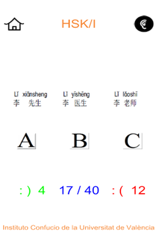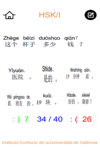 This is an educational program developed by the Confucius Institute at the University of Valencia (Spain), which allows to prepare the official Chinese level test HSK (Level I) from examples of examination issued by Hanban.