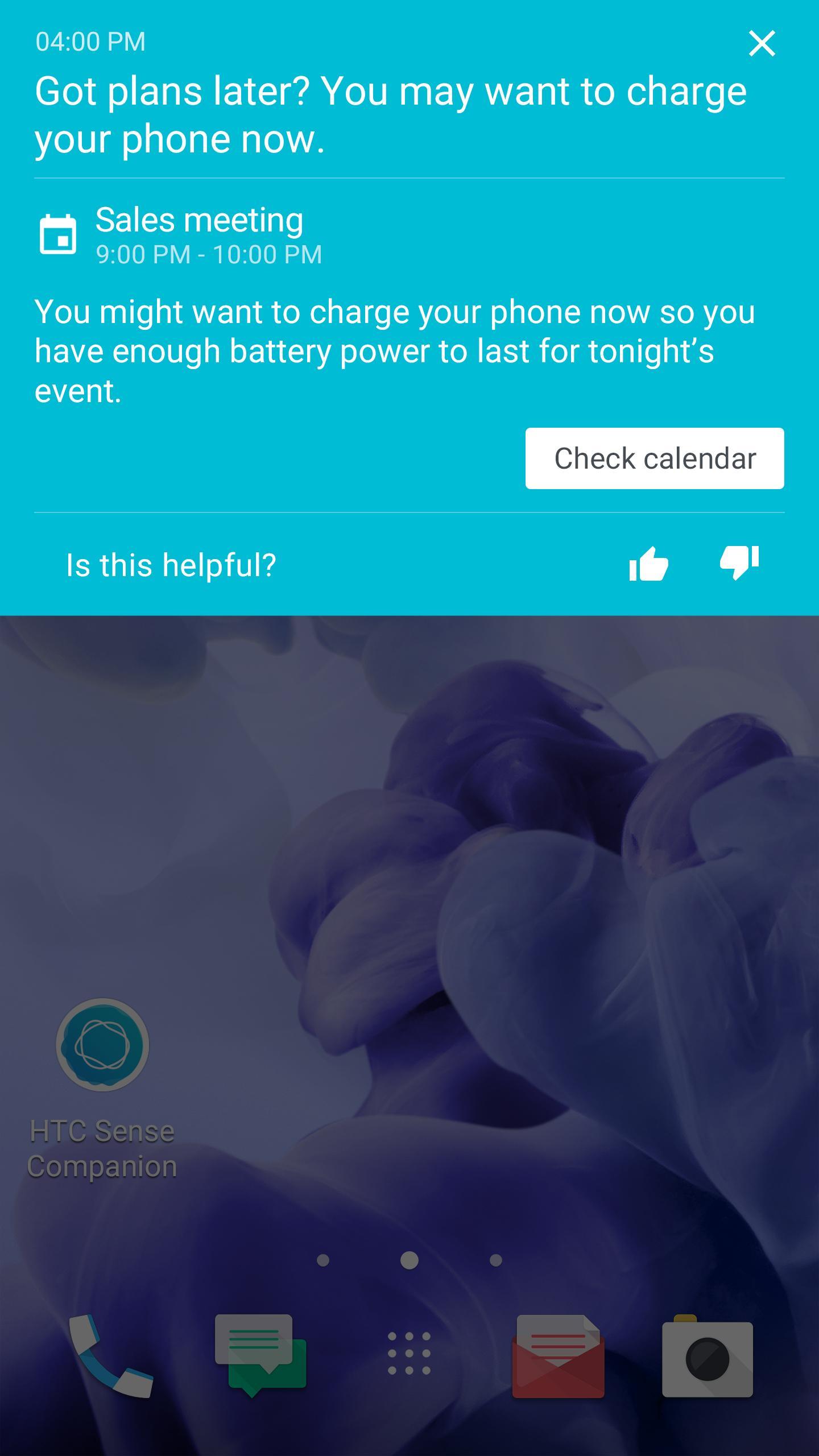 HTC Sense Companion is a personal companion that’s always learning from you, and the things you do every day. It’s made to evolve and get to know you better over time so it can give you better and more relevant suggestions and information.