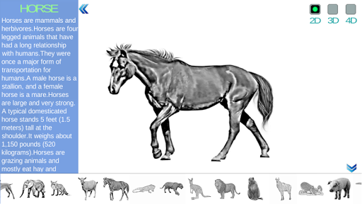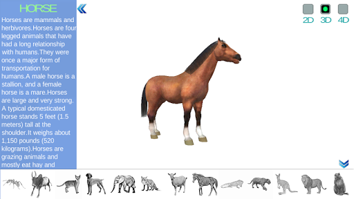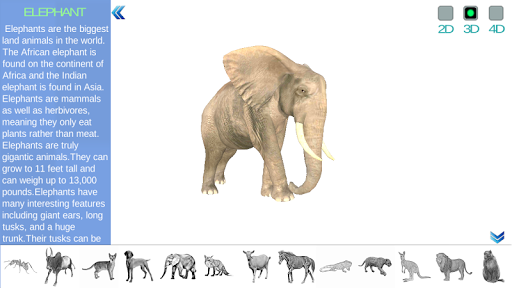 The animals can be viewed in 2D, 3D & 4D (Augmented Reality) mode in this App.
