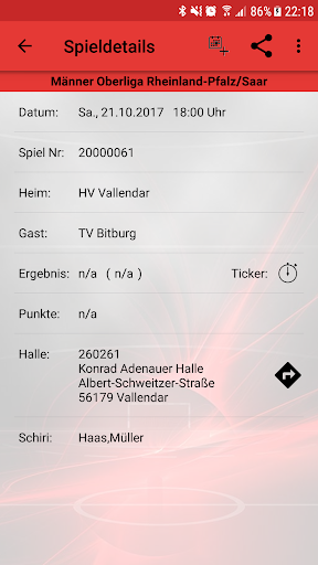 - Details zu einem Spiel (z.B. Datum, Uhrzeit, Halbzeitergebnis, Schiedsrichteransetzung, Hallenanschrift etc.)