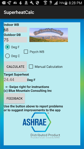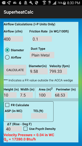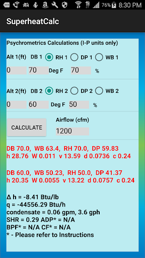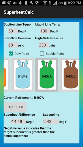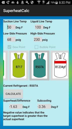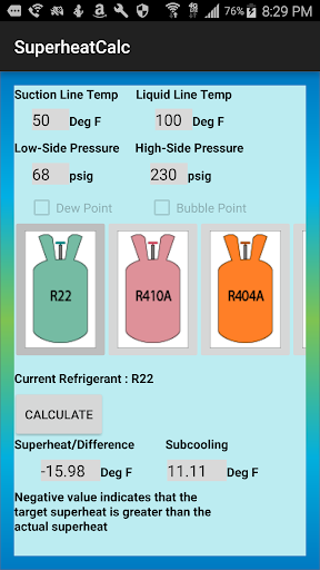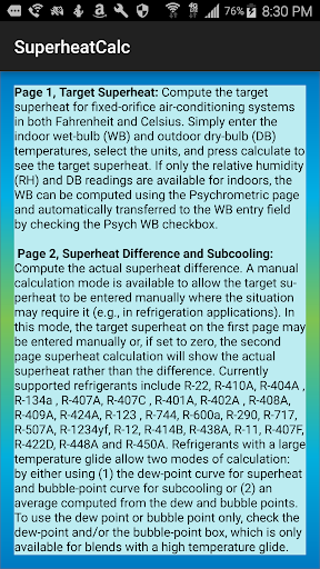 Calculator app for use in HVACR diagnostics and service. Can calculate target superheat for fixed orifice expansion devices, superheat and subcooling for 26 refrigerants, airflow calculations and psychrometric calculations to aid with field service of HVACR equipment. Detailed instructions on using the app may be viewed by swiping right after opening the app.