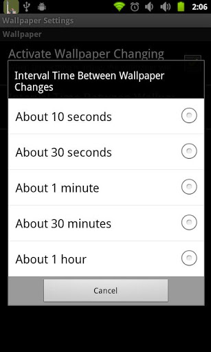 The wallpaper changes at an interval that you specify by tapping the Settings button and selecting how often you want the wallpaper to change to a different one.