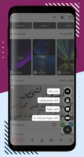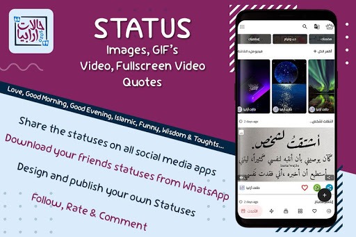 You can easily create your own statuses through our app and share them with your friends on WhatsApp and other apps, choose the font, the color and immediately share it as a picture or upload it to the application to share with users. You can also add ready-made images, GIFs and Youtube links.