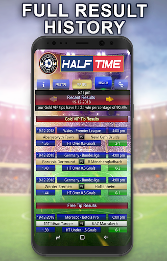 With our Half Time betting app, we have a full results history of our football prediction and betting tips that we have provided since we first published our betting app. Our betting app includes FREE football tips, VIP football tips and the outcome of our football prediction in the results section. In our betting app, we also display what our win rate as a percentage was for the football tips we gave the previous day.