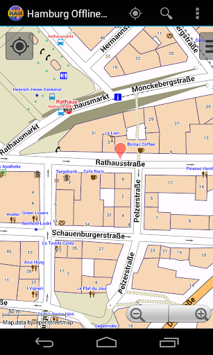 With this app you have the map of Hamburg right in your pocket! It offers an interactive map that lets you browse the city at amazing detail. Additionally, it comes with a search index for locating streets, but also other places of interest such as museums, restaurants, cafés, hotels, sights and many more. After installing the app, no internet access is required anymore, neither for browsing the map nor for using the search functionality. As a result, the map loads reliably fast and it helps you reducing your data usage to stay within the limits of your data plan. Even if you're a tourist and do not have any mobile data plan at all, the map works equally well, independent of WIFI connectivity.