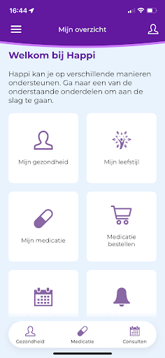 - Happi App: this gives patients knowledge, ease and trust in dealing with their chronic illness so that they can lead a healthy and happy life. By means of disease-specific health goals, there is a quick insight into how you are doing. You can also easily order your repeat medication via the app (for patients living in the Netherlands) and Happi is supported by the various patient associations.