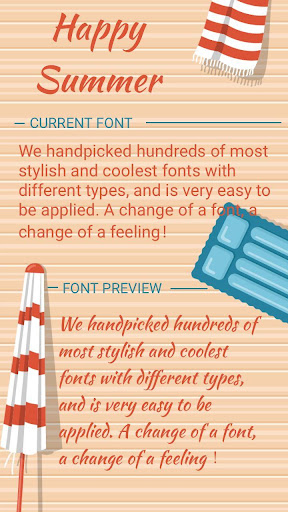 Happy Summer allows all users to change the system font of your phone or tablet 👌. Supported for devices which have FlipFont™ (Samsung Galaxy S3, S4, S5, Note, Note Ⅱ, Note Ⅲ) to change fonts perfectly or root access. This is absolutely the best installer FlipFont for android!
