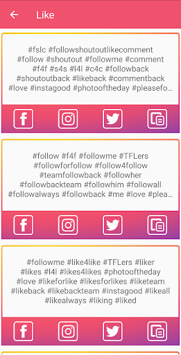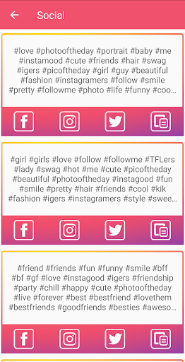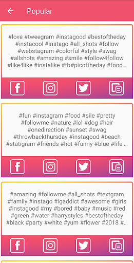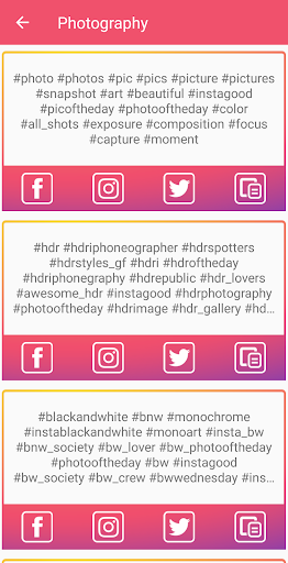 You will get more likes and followers using this hashtags app in your photos on Instagram, Facebook and Twitter status. Fast, easy and the best tags!