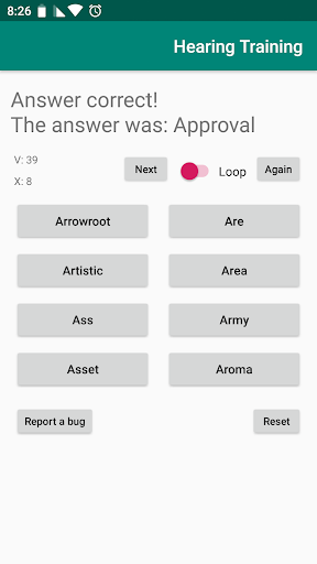 This game was created specifically for hearing impaired individuals who recently received a cochlear implant or recently were fitted with hearing aids. The app will enunciate English words and you must select the correct word that you heard.