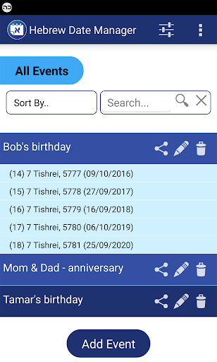 Hebrew Date Manager is the only application that lets you create, edit, delete and share recurring events (birthdays, anniversaries, memorials, etc.) according to the Jewish calendar and sync them with external calendars such as Google Calendar.