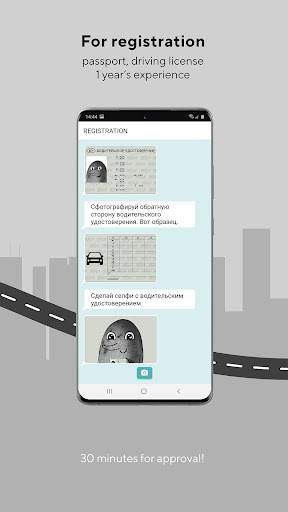 Registration can be done through the application with an experience of less than 1 year category B. To do this, you must have a passport and a driver's license. Since for security reasons there is no possibility of downloading a photo of documents from the device's memory, photos will need to be taken at the time of registration, that is, documents must you. Document verification and account approval take no more than 30 minutes.