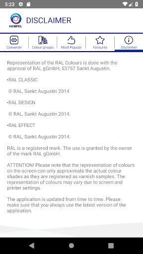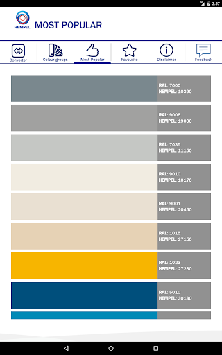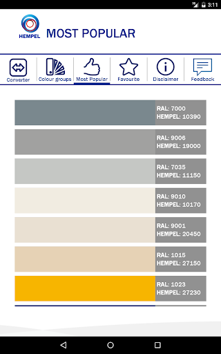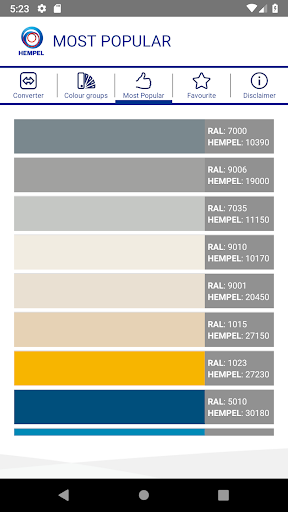 This application enables you to find equivalent Hempel and RAL Classic colour shades, and also similar colours and colour groups. It also shows you the ‘Most Popular’ shades in Hempel.