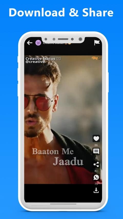 Keep a video status, and share it with your friends across all of social media like facebook, whatsapp, instagram, etc. Save funny short videos, jokes, gifs, audio songs, shayari, motivational quotes, funny quotes, bhajans, devotional songs, funny images, and much more from one platform. Share regional videos with your friends and the people who speaks in your own language. Hindi language users can now download Hindi videos, Hindi love video songs, Hindi shayari, and Hindi WhatsApp status videos and similarly, there are Tamil WhatsApp videos status, Telugu WhatsApp video status, Kannada WhatsApp video status, Marathi WhatsApp video status, Gujarati WhatsApp video status, Bengali WhatsApp status, Urdu WhatsApp video status, and Malayalam WhatsApp video status. You can download videos in just one click.