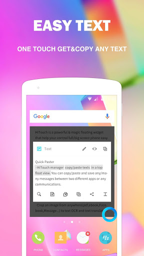 ·HiTouch manager copy/paste texts in a top float view. You can copy/paste and save any/many messages between two different apps or any communications.