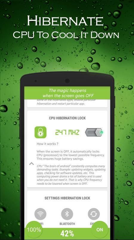 Hibernate forcibly stops the power consuming apps and settings to execute their processes to save and improve battery life of your android device.