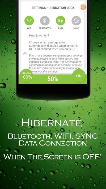 Unlike many battery saver apps, Hibernate - The Real Battery Saver operate when the screen of your device is off, which means you don't have to worry about using applications or some settings you need; as Hibernate works only when your phone is in idol condition. As long as the phone is in sleep mode, Hibernate blocks all the power consuming apps and settings to drain battery, which saves ample amount of power for your next time usage.