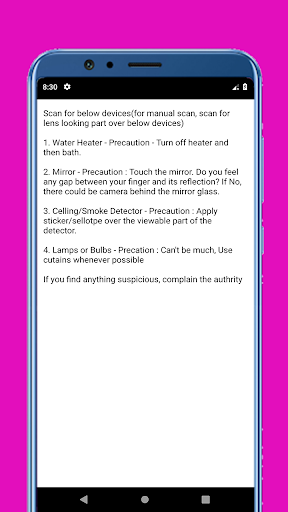 Spy camera and spy devices are place in hotel. this hidden camera detection have special filter for finding hidden camera. for example mostly hidden devices are place the following area. like bathroom hidden camera bedroom spy camera and microphone move your mobile near every device and the secrets devices detector app will show possibility of hidden spy microphone and camera. so you use this app as infrared camera detector and night vision camera finder.