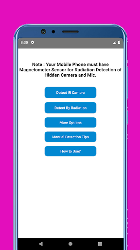 Hidden devices detector free app for android will detect spy devices like hidden spy camera hidden spy microphone bugs infrared camera, so do not wait download this hidden spy devices detector app for android now. The Radiation meter show possibility of spy devices. people are searching for application to find spy devices like hidden camera detector and bug detector and spy microphone finder. this hidden devices is solution for all spy devices finder. To find hidden spy devices it is now very easy to scan hidden spy devices.
