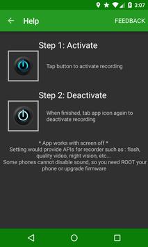 - Turn screen off and continue recording. That saves battery and allows long recording