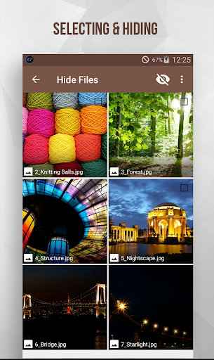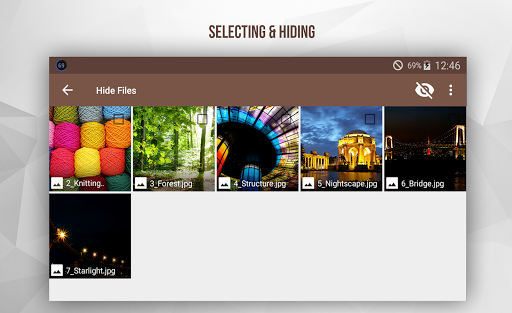 Launch the app. A list of folders containing your VISIBLE videos and images will appear. To hide a file just select the folder containing it, that will come up with a new interface where you can select witch ones to hide. You can select many at once, or all of them by pressing select all button. Then press the eye icon to hide them all.