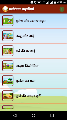 ヒンディー語キッズストーリーアプリケーションへようこそ。このアプリケーションには100以上のストーリーがあります。Entertainmentによると、このヒンディー語の子供たちのストーリーアプリケーションは子供にとって有益です。たとえば、長老たちの名誉、真実、悪と戦うための励まし、貪欲、悪い人の関連は痛みを伴い、誰もが利己的な友人が好きではなく、良い人は常に他の人を助け、同様に子供たちは多くの教育を受けます。物語は子供たちの話を聞くのが好きになるでしょう。そして、これらの物語は、子どもたちに社会生活と行動の知識を与えます。これらすべての物語から受け取られたメッセージは、子どもたちが自分の行動をもたらすなら、間違いなく未来と一緒に良い男に行くでしょう。身体的および精神的発達により、子どもたちは脳の発達に不可欠です。もちろん、これらの物語は多くの開発開発に役立ちます。