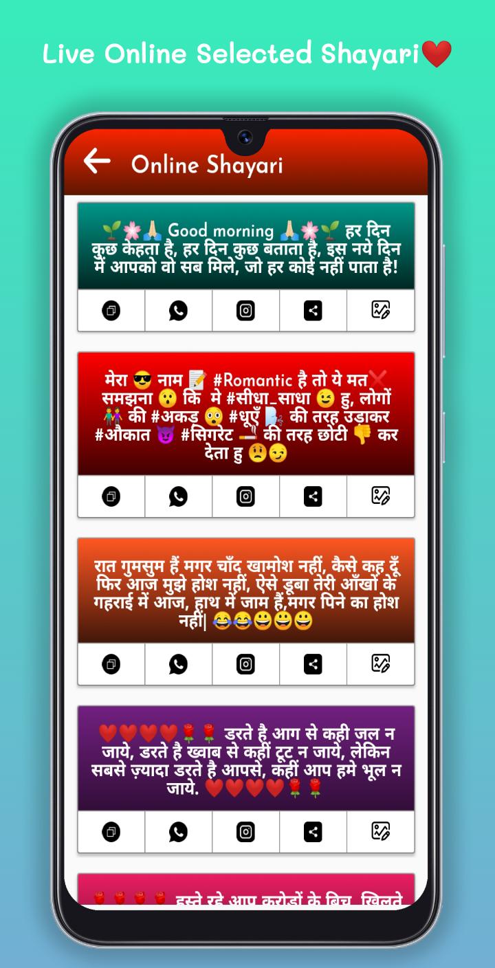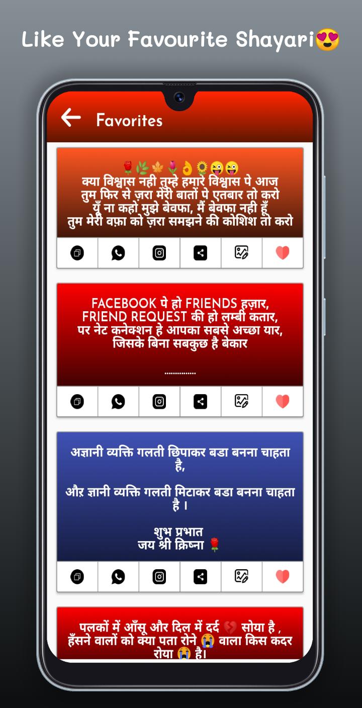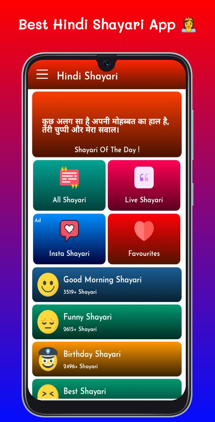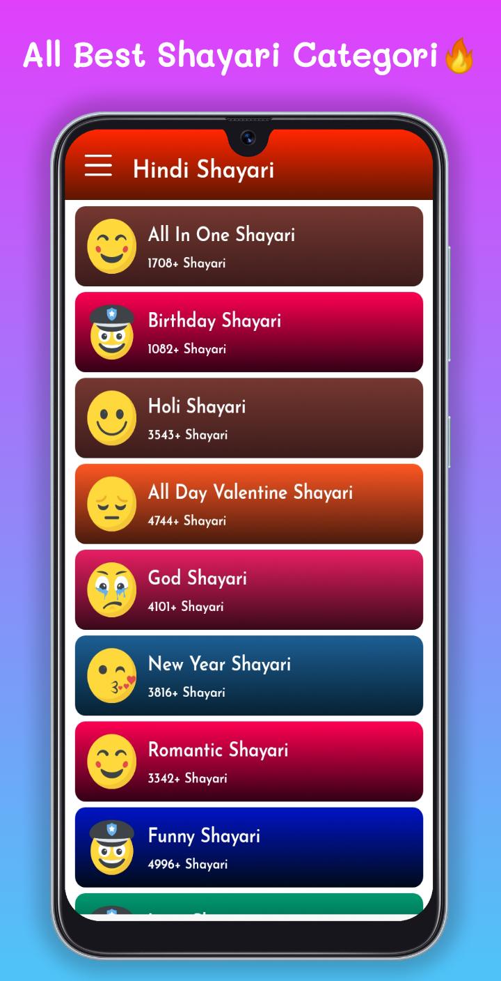 This app is very easy to use and work smoothly and this app have 100000+ unlimited daily New updated hindi love shayari and this app has lots of shayari category.