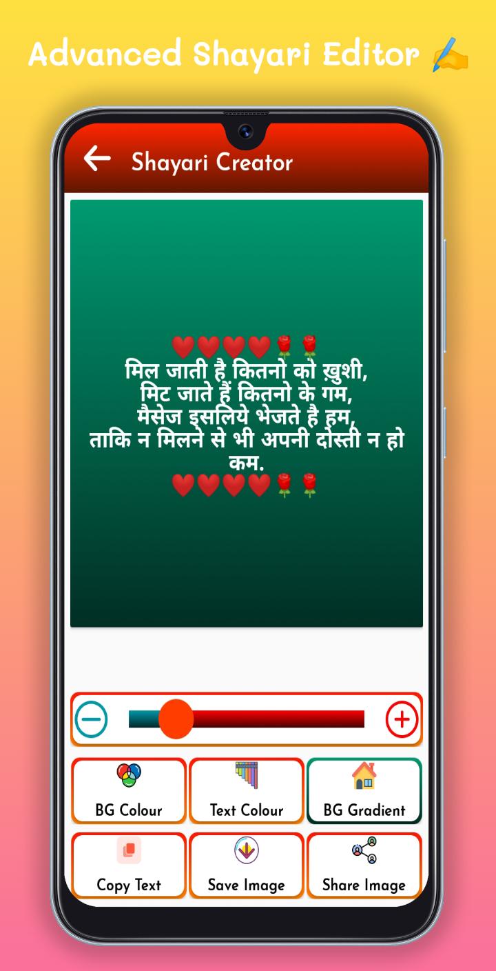 in this app and easily share copy edit convert shayari in images and change text color Text size background colour and gradient and send
