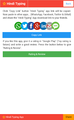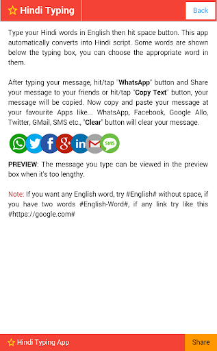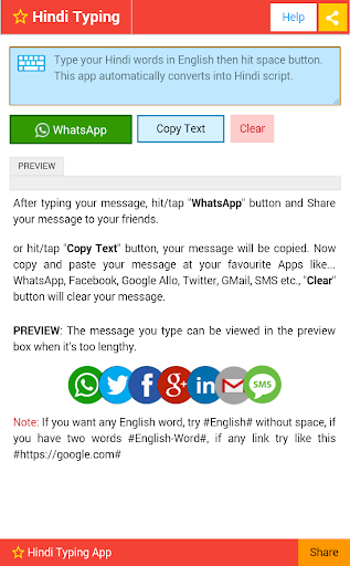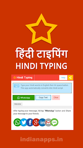 Hindi Typing (Type in Hindi) app is an English to Hindi transliteration tool. Type your Hindi words in English and hit/tap space button. This app automatically converts into Hindi script.