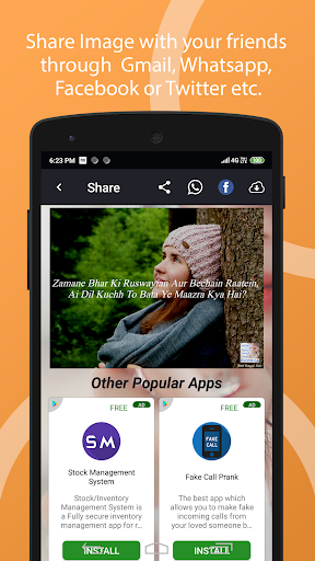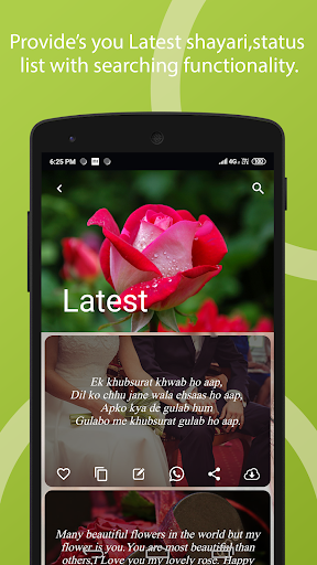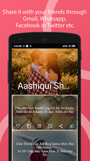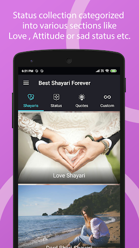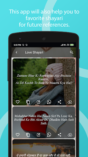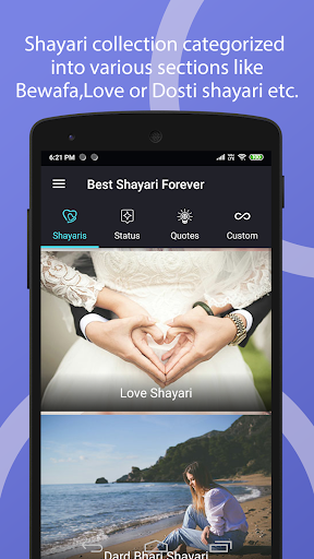 Best Shayari Forever App contains different categories of Shayari, Status and Quotes collection with daily feeds, you can easily send on social media either text or image, you may able to change the background image also.