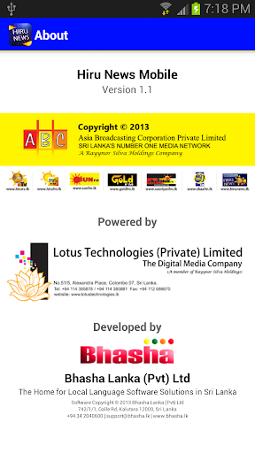 Hiru News Android app is powered by Asian Broadcasting Corporation (Hiru TV, Hiru FM, Sha FM, Sun FM, Gold FM, Sooriyan FM) & technically powered by Bhasha Lanka (Pvt) Ltd.