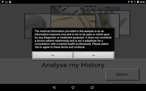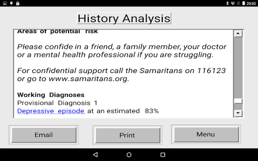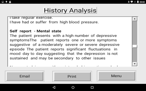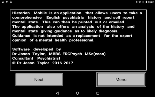 Historian is a free app written by a UK Consultant Psychiatrist and aims to take a comprehensive automated psychiatric history using a simple pick and click approach from a series of scrolling grids. The app also takes a detailed self report mental state and stores this anonymised data on your mobile device for printing or emailing or for automated analysis. For convenience, histories can be taken in more than one sitting.The generate a history and analysis options generate reports exploring key symptoms, areas of risk and likely diagnoses. All data is only stored on the mobile device and can be deleted by the end user at any time and no data is knowingly shared with 3rd parties.