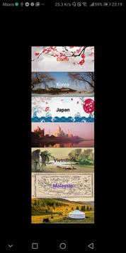 The categories of the country are the following: 1.China (Available) 2.Korea(Coming Soon) 3.Japan (Coming Soon) 4.India(Coming Soon) 5.Vietnam(Coming Soon) 6.Malaysia(Coming Soon) 7.Mongolia(Coming Soon) *INTERNET required for showing pictures *