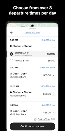 Get a ride on your schedule. No matter when you book from 7AM to 7PM, you will be guaranteed a comfortable car-ride within a maximum of 2 hours after your request. You will never have to worry about missing your scheduled ride.