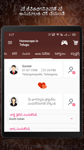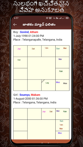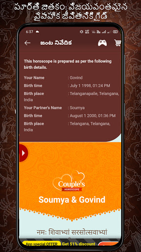 The Telugu Jathakam app also provides options for vivaha gunamelanam. Gain access to the love match report based on zodiac signs. In addition to the above, you can also generate the Couple’s horoscope report which guides the couple and provides guidelines to lead a fulfilling and happy married life.