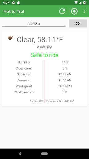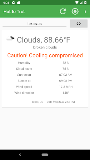 View riding safety & current weather for your location or anywhere in the world with this easy-to-use app. You'll know whether your horse is in danger of overheating with a quick glance.