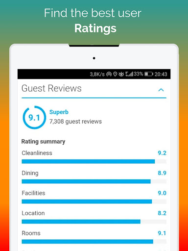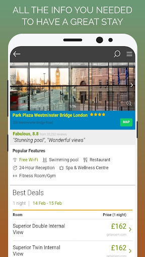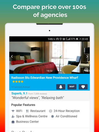 We compare the price of each hotel with 5 000 000 s of online hotel booking websites.Hotel Booking is an app designed to help you find the right hotels where you can get proper accommodation at a very good price. The app covers thousands of hotels all over the world, and you have an immediate hotel price compare feature and a great way to find great and cheap accommodation anywhere you want to go.