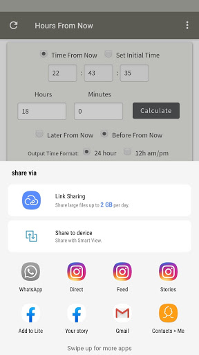 This apps helps you easily calculate hours, minutes and days between any number of hours. The results are displayed on 24 or 12 Hours Clock System in form of Minutes, Hours and Days. You Can also calculate hours from now and hours before now and also set your own custom time.