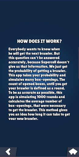 Everybody wants to know when he will get the next Brawl Stars Brawler. This question can't be answered exactly, because Supercell doesn't give us that information. We just get the probability for each Brawl Star Brawlers rarity. This app takes your probability and simulates many Brawl Box openings. The count of opened Brawl Boxes, until you get your Brawl Stars brawler is defined as round. To be as accurate as possible, this app is simulating 1000 rounds and calculates the average number of draws, that had been necessary to get the Brawl Stars brawler. This method gives you an idea how long it can take to get your new Brawl Stars brawler.