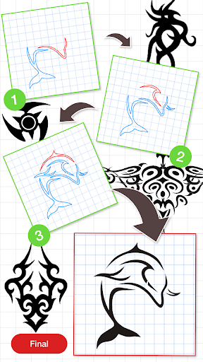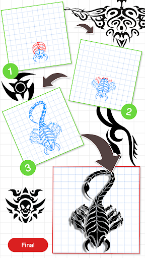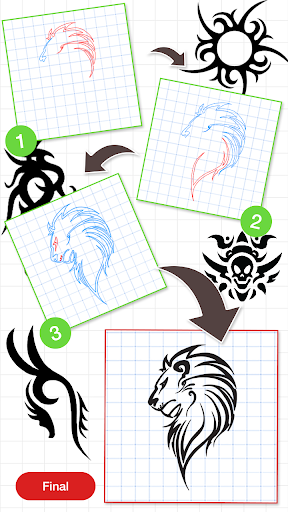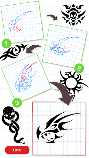 Each drawing is divided into few steps, and it is easy to follow so this app shows you how to draw tattoos step by step easily.