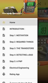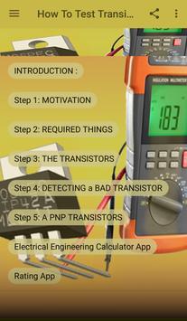 This application consists many information on how to test electronic components.Usually electronic components been test using a multimeter.In this application you will learn how to test Transistor PNP and NPN.When you understand how to test this type of components you will gain a better understanding on electronic engineering...