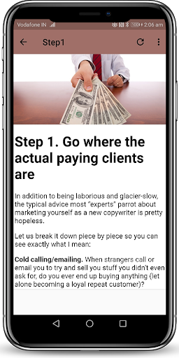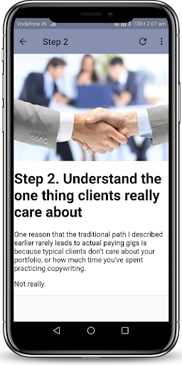 So far, we have added 6 steps inside app. We will add more to the app on a regular basis. If you want to have more tips and tricks information about how to become a copywriter or anything else inside the app, please contact us from inside the app and we will contact you.