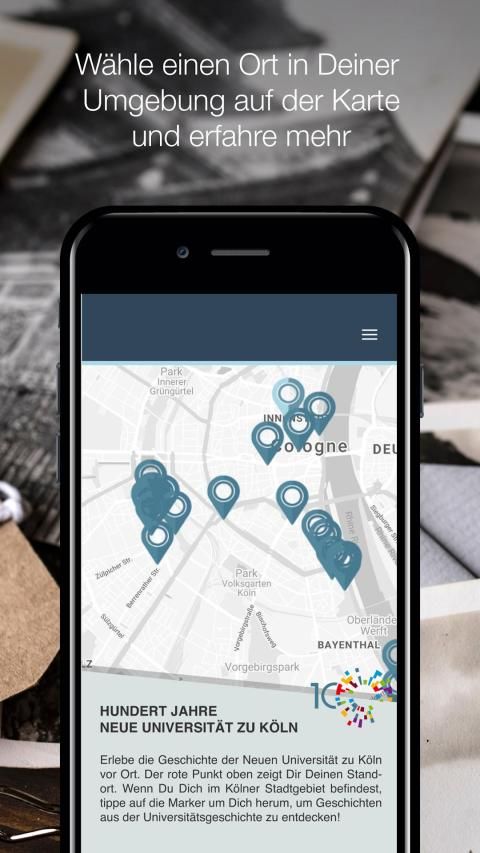 Mit der App „100 Jahre Uni Köln“ erleben Sie Geschichten aus der Universitätsgeschichte vor Ort. Vom Campus bis in die Kölner Innenstadt erfahren Sie an fast 30 Orten mehr zu Persönlichkeiten, Gebäuden, Ereignissen und vielleicht die ein oder andere Kuriosität aus den letzten 100 Jahren der Kölner Universität. Bildergalerien, Videos und ein Audioguide bieten Ihnen dabei die Gelegenheit, die Universitätsgeschichte auf spannende Weise zu entdecken und den ein oder anderen, vielleicht schon bekannten Ort, mit ganz anderen Augen zu sehen.