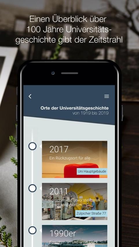 With the app "100 Years University of Cologne" you can experience stories from the history of the university on site. From the campus to the center of Cologne, you will find out more about personalities, buildings, events and perhaps one or the other curiosity from the last 100 years of the University of Cologne at almost 30 locations. Picture galleries, videos and an audio guide offer you the opportunity to discover the history of the university in an exciting way and to see one or the other, perhaps already known, place with completely different eyes.