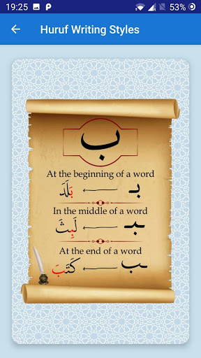 Also this application introduces to Writing styles of Arabic letters, by which one can learn how to write Arabic letters in different formats of Arabic Script.